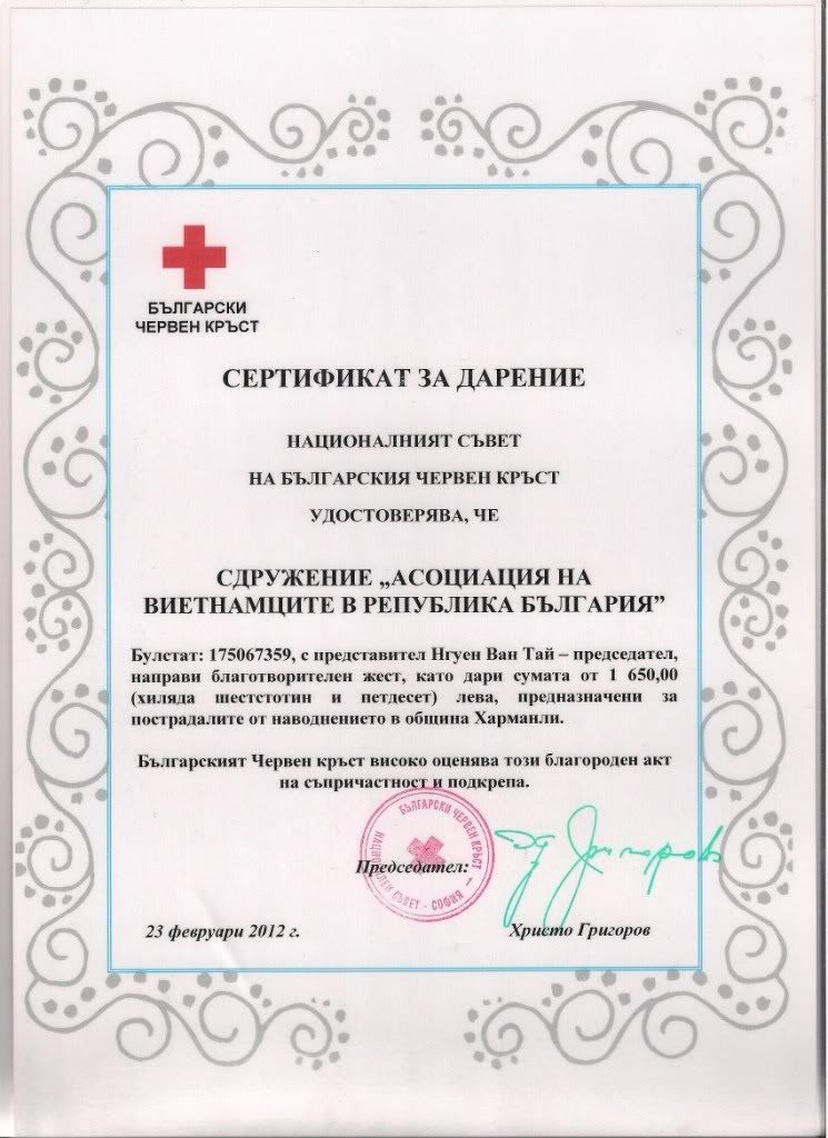 Vì vậy, liên quan đến mục “Bài viết về Bungari” xin gửi đến các Anh Chị để tham khảo thôi, tin về hoạt động “uống nước nhớ nguồn” của bà con người Việt bên đó, kèm ảnh trong đó có 2 người có lẽ các Anh Chị cũng biết: anh Tài, Chủ tịch Hội người Việt, nguyên thực tập sinh khóa 5; anh Hoàng, Phó Chủ tịch nguyên sinh viên ở Vác-na. Tin này ở trên trang web của Hội chữ thập đỏ Bungari: